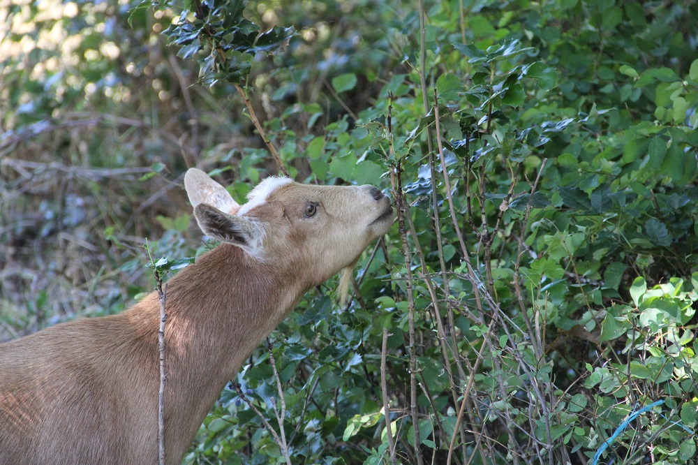 We take our does on a long browsing walk just about every day. They also have free access, in good weather, to 2 acres of grasses, browse, and forbs. They relish such wild delicacies as poison oak, madrone, manzanita, pine, oak, fir, lichens, blackberry, grape, star thistle, and an assortment of other seasonal plants. We keep them moving so that they don’t gird up smaller trees. We also do some forest thinning and lop off branches for fire abatement and more food for the does. They also are fed locally grown high quality alfalfa and orchard grass hay. (Adult wethers and bucks do not receive alfalfa due to the disproportionate amount of calcium to phosphorus – which will cause urinary stones that can kill them ).